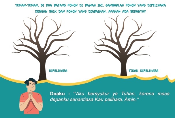 Teman-teman, jika mbah Sami langsung menebang pohon mangga karena anak-anak tetangga sering merusak genting rumahnya meskipun pohon mangga itu berbuah lebat dan enak, tidak demikian dengan TUHAN. Dalam doanya, Salomo menyebut TUHAN sebagai yang memelihara umat-Nya, meskipun umat-Nya sering melakukan dosa. Dengan kasih-Nya, TUHAN merawat dan memelihara umat-Nya, Israel. Jika TUHAN memelihara bangsa Israel, demikian juga TUHAN pasti memelihara hidup dan masa depan kita sebagai anak-anak milik-Nya.