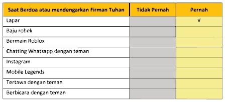 Di bawah ini ada beberapa contoh hal yang bisa mengalihkan kita pada saat berdoa atau mendengarkan firman Tuhan.