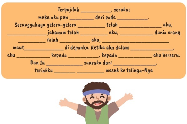 Dalam bacaan kita hari ini, kita menjumpai kegembiraan Daud karena Tuhan menolongnya terbebas dari kejaran Saul. Untuk mengungkapkan rasa gembiranya, Daud menyanyikan sebuah lagu kepada Tuhan yang ditulis pada bacaan kita hari ini. Inilah syair-syair lagu Daud kepada Tuhan. Lengkapilah kata-kata yang hilang: