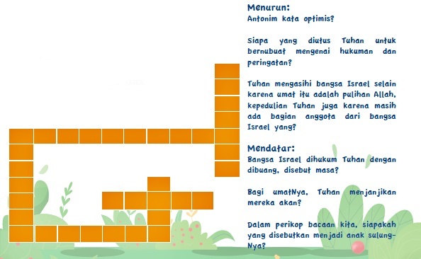 Teman-teman, tentunya kita juga sering mengalami putus asa dan pesimis. Entah itu dalam mengerjakan tugas menganggap diri tidak mampu dan tidak berani tampil karena takut nanti akan diolok-olok. Nah, berangkat dari kisah Yeremia dan bangsa Israel, kita juga harus memiliki sikap yang optimis, percaya bahwa Tuhan akan menolong dan akan menjaga kita bahwa dalam juga dalam pengembangan talenta kita. Sebagai kreativitas, yuk kita kembangkan daya berpikir kita dengan mengerjakan teka-teki di bawah ini