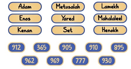 Setelah kita membaca bacaan hari ini, tahulah kita bahwa manusia bertambah banyak dan usia manusia juga banyak. Yuk….kita cermati usia manusia pada jaman Adam sampai Nuh ya. Kalian bisa mencocokkan dengan menarik garis umur manusia pada waktu itu: