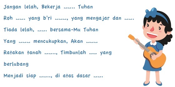 Teman-teman, yuk kita menyanyi lagu yang memberi semangat pada kita untuk tetap berjuang tanpa lelah melakukan kebaikan. Judul lagunya : Jangan Lelah. JIka kalian tidak bisa lagunya, kalian bisa lihat linknya di video ini. Sambil bernyanyi, lengkapilah syairnya di seperti bawah ini ya: