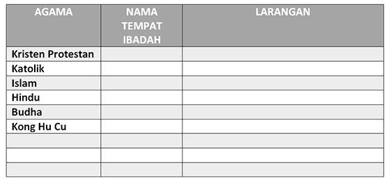 - Remaja diajak untuk mengenal tempat ibadah agama lain, jika di sekitar gereja ada tempat ibadah agama lain, ajak mereka berkunjung ke tempat tersebut. (Pamong terlebih dahulu berkoordinasi dengan Majelis Jemaat dan Pengurus tempat Ibadah tersebut untuk berkegiatan disana)