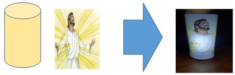 Pamong menyediakan gambar Tuhan Yesus dimuliakan diatas gunung (Lihat Aktivitas Pratama. Gambar terdapat di CD) sejumlah anak Madya, mikha dan lem. Pamong mengarahkan anak-anak untuk menggabungkan dua sisi kertas menjadi bentuk balok lalu diberi senter di dalam kertas itu saat nanti anak-anak di rumah.
