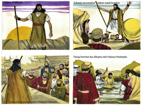 Pagi hari ini kita akan belajar dari tokoh Yohanes Pembaptis (tunjukkan gambar 1) Seseorang yang memakai jubah bulu unta dan ikat pinggang kulit, yang makannya adalah belalang dan madu hutan. Yohanes Pembaptis ini adalah orang yang diutus oleh Tuhan untuk mewartakan ajakan bertobat (tunjukkan gambar 2). Apa itu bertobat? Bertobat itu, mengaku salah, meminta maaf dan tidak mengulanginya lagi. Coba ulangi pelan-pelan, bertobat itu…. Mengaku salah-meminta maaf-tidak mengulangi lagi.. Yohanes Pembaptis mengajak orang banyak untuk bertobat, akhirnya orang banyak ramai-ramai datang untuk mendengarkan Yohanes Pembaptis (tunjukkan gambar 3). Lalu apa yang dilakukan oleh banyak orang itu setelah mendengarkan Yohanes? Mereka mau bertobat, kalau begitu mereka mau? Mengaku salah-meminta maaf-tidak mengulangi lagi. Sebagai tanda bahwa mereka bertobat, mereka akan dibaptis, yakni akan di masukkan ke dalam air seperti ini (tunjukkan gambar 4) Untuk apa sih mereka harus bertobat? Untuk apa mereka harus mengaku salah-meminta maaf-tidak mengulangi lagi? karena mereka mau menyambut kedatangan Tuhan Yesus di dunia. Tuhan Yesus yang adalah juruselamat dunia, perlu disambut dengan hati yang sudah baik. Tuhan Yesus mau menerima semua orang yang sudah siap untuk menyambut kedatangan-Nya yakni mereka yang sudah bertobat, apa tadi bertobat itu? (pamong mengajak anak-anak untuk mengingat kembali) bertobat itu mengaku salah-meminta maaf-tidak mengulangi lagi.