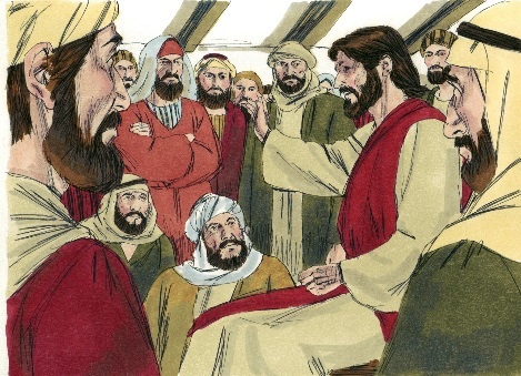 Apakah ada yang tahu cerita dari gambar ini? Kira-kira, siapa tokoh yang duduk ini ya? Lalu, sedang apa tokoh itu? Siapakah orang-orang yang ada di sekitar tokoh itu? Coba baca Lukas 4 : 16 – 30. Minta tolong tiga orang untuk membacanya bergantian. Jadi ini adalah gambar Tuhan Yesus yang sedang mengajar banyak orang. Sebelum mengajar, Tuhan Yesus selalu membaca Alkitab lebih dulu. Setelah itu, baru Ia mengajar tentang apa yang baru saja dibaca-Nya. Yesus mengajar dengan sangat baik sampai-sampai semua yang mendengar-Nya terheran-heran. Ia sangat pandai dalam memahami isi Kitab Suci. Masih ingat kisah Yesus saat dicobai iblis di padang gurun, kan? Saat itu Yesus menang berdebat dengan iblis karena kepandaian-Nya itu.