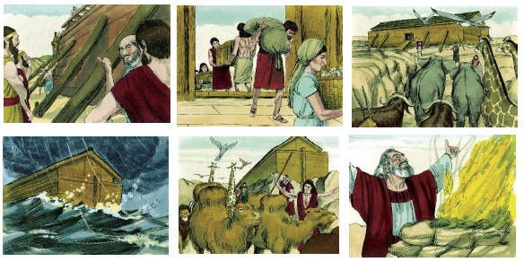 Setelah perahu siap dibuat, lalu Tuhan meminta Nuh untuk menyiapkan segala bahan makanan yang harus dibawa dan dimasukkan ke dalam perahu (Pamong menunjukkan gambar 2). Tuhan juga meminta Nuh untuk mengambil binatang-binatang untuk diselamatkan (Pamong dapat menunjukkan gambar 3). Setiap binatang sepasang, jantan dan betina. Setelah semua siap, perahu ditutup dan Tuhan mendatangkan hujan lebat selama 40 hari 40 malam (Pamong menunjukkan gambar 4). Setelah 40 hari 40 malam hujan berhenti, tetapi Bumi masih diliputi air. Selama 150 hari Bumi penuh dengan air.